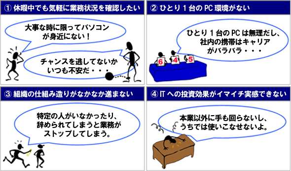 オフィスを持ち歩こう!外出が多い人でも、いつでもどこでもスマートフォンで簡単に利用できます。支店や店舗が離れていてもオルカなら問題ありません。 |