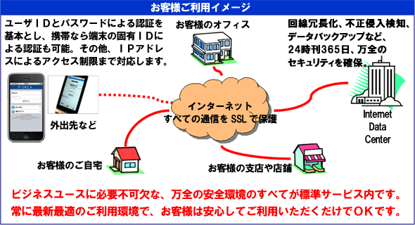 万全のセキュリティ高度暗号化通信、IP認証機構、データバックアップからハードウェアの冗長化まで、365日24時間監視体制のセキュリティ環境 |